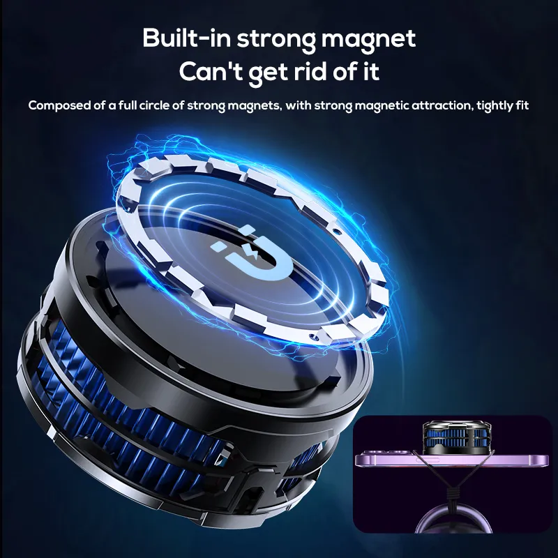 اتصال مگنتی (Magnetic): کلمه Magnetic (تلفظ: مگنِتیک) به معنای آهنربایی است. این فن با قدرت جذب بالا به پشت آیفونهای سری مگسیف و گوشیهای مگنتی میچسبد. برای سایر گوشیها نیز میتوانید از برچسب آهنربایی داخل جعبه استفاده کنید.